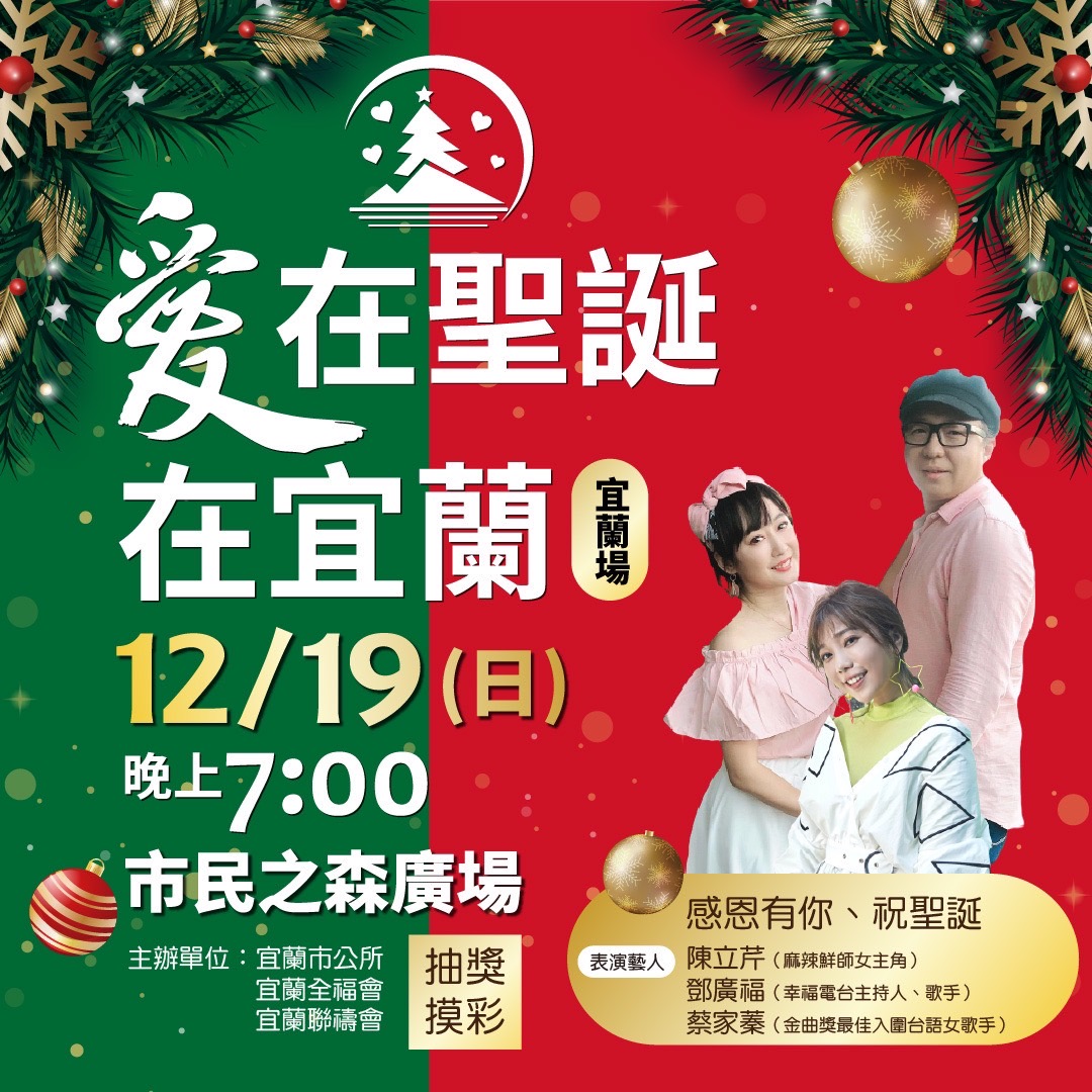 邀請所有的鄉親好朋友在12月11號(六)晚上在羅東中山公園、12月19號(日)在宜蘭市市民之森廣場、12月26號(日)在宜蘭運動公園,晚上七時皆有聖誕晚會,以及聖誕禮物摸彩活動!